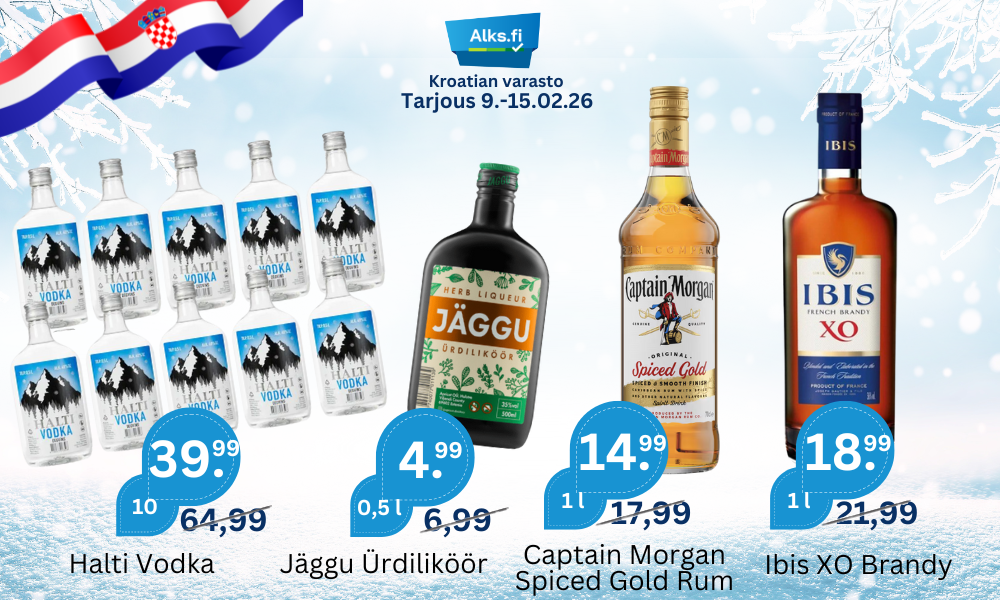 Suosittuja tuotteita AlePure Divine Vodka 37.5% 3 l BIB 30.99€ Alkuperäinen hinta oli: 30.99€.24.99€Nykyinen hinta on: 24.99€. - Pure Divine Vodka 37.5% 3 l BIB määrä + Lisää ostoskoriin AleDr. Zenzen Riesling 11.5% 3 l BIB 10.99€ Alkuperäinen hinta oli: 10.99€.9.99€Nykyinen hinta on: 9.99€. - Dr. Zenzen Riesling 11.5% 3 l BIB määrä + Lisää ostoskoriin AleHartwall Hard Seltzer Raspberry 4.5% 24×0.33 l 25.99€ Alkuperäinen hinta oli: 25.99€.23.99€Nykyinen hinta on: 23.99€. - Hartwall Hard Seltzer Raspberry 4.5% 24x0.33 l määrä + Lisää ostoskoriin AleHartwall GLÖGG Original Long Drink 5.5% 24×0.33 l 29.99€ Alkuperäinen hinta oli: 29.99€.17.99€Nykyinen hinta on: 17.99€. - Hartwall GLÖGG Original Long Drink 5.5% 24x0.33 l määrä + Lisää ostoskoriin AleKoff LIME & VODKA Long Drink 5.5% 24×0.33 l 23.99€ Alkuperäinen hinta oli: 23.99€.19.99€Nykyinen hinta on: 19.99€. - Koff LIME & VODKA Long Drink 5.5% 24x0.33 l määrä + Lisää ostoskoriin AleA. Le Coq G:N WATERMELON Long Drink 5.5% 24×0.33 l 17.99€ Alkuperäinen hinta oli: 17.99€.15.99€Nykyinen hinta on: 15.99€. - A. Le Coq G:N WATERMELON Long Drink 5.5% 24x0.33 l määrä + Lisää ostoskoriin AleHartwall Hard Seltzer Lemon 4.5% 24×0.33 l 25.99€ Alkuperäinen hinta oli: 25.99€.23.99€Nykyinen hinta on: 23.99€. - Hartwall Hard Seltzer Lemon 4.5% 24x0.33 l määrä + Lisää ostoskoriin AleHartwall GIN & LEMONADE Original Long Drink 5.5% 24×0.33l Best Before: 30.03.2026 29.99€ Alkuperäinen hinta oli: 29.99€.18.99€Nykyinen hinta on: 18.99€. - Hartwall GIN & LEMONADE Original Long Drink 5.5% 24x0.33l Best Before: 30.03.2026 määrä + Lisää ostoskoriin AleHalti Viina 32% 10×0.5 l PET 54.90€ Alkuperäinen hinta oli: 54.90€.35.99€Nykyinen hinta on: 35.99€. - Halti Viina 32% 10x0.5 l PET määrä + Lisää ostoskoriin Punaviini Näytä kaikki JP. Chenet Cabernet Syrah 12.5% 3 l BIB 13.99€ - JP. Chenet Cabernet Syrah 12.5% 3 l BIB määrä + Lisää ostoskoriin Penasol Sangria Original 7% 3 l BIB 7.99€ - Penasol Sangria Original 7% 3 l BIB määrä + Lisää ostoskoriin Barefoot Cabernet Sauvignon 13% 0.75 l 7.99€ - Barefoot Cabernet Sauvignon 13% 0.75 l määrä + Lisää ostoskoriin AleTerra Molino Tempranillo 11% 3 l BIB 7.99€ Alkuperäinen hinta oli: 7.99€.6.99€Nykyinen hinta on: 6.99€. - Terra Molino Tempranillo 11% 3 l BIB määrä + Lisää ostoskoriin Gran San-Tiago Merlot Shiraz 13.5% 3 l BIB 9.99€ - Gran San-Tiago Merlot Shiraz 13.5% 3 l BIB määrä + Lisää ostoskoriin Gato Negro Cabernet Sauvignon 13% 0.75 l 4.99€ - Gato Negro Cabernet Sauvignon 13% 0.75 l määrä + Lisää ostoskoriin AleSun of Africa Cape Red 13% 3 l BIB 7.99€ Alkuperäinen hinta oli: 7.99€.6.99€Nykyinen hinta on: 6.99€. - Sun of Africa Cape Red 13% 3 l BIB määrä + Lisää ostoskoriin South Cape Red 12.5% 3 l BIB 7.99€ - South Cape Red 12.5% 3 l BIB määrä + Lisää ostoskoriin Babić 12.5% 0.75 l 11.99€ - Babić 12.5% 0.75 l määrä + Lisää ostoskoriin Korlat Merlot Eco 14.5% 0.75 l 17.99€ - Korlat Merlot Eco 14.5% 0.75 l määrä + Lisää ostoskoriin Valkoviini Näytä kaikki AleSun of Africa Cape White 12% 3 l BIB 7.99€ Alkuperäinen hinta oli: 7.99€.6.99€Nykyinen hinta on: 6.99€. - Sun of Africa Cape White 12% 3 l BIB määrä + Lisää ostoskoriin Jean Biecher & Fils Alsace Pinot Blanc 12.5% 0.75 l 5.99€ - Jean Biecher & Fils Alsace Pinot Blanc 12.5% 0.75 l määrä + Lisää ostoskoriin Gato Negro Chardonnay 13% 0.75 l 4.99€ - Gato Negro Chardonnay 13% 0.75 l määrä + Lisää ostoskoriin AleJP Chenet Colombard Sauvignon 12% 0.25 l 1.59€ Alkuperäinen hinta oli: 1.59€.1.19€Nykyinen hinta on: 1.19€. - JP Chenet Colombard Sauvignon 12% 0.25 l määrä + Lisää ostoskoriin Maybach Chardonnay Trocken 12% 0.75 l 4.99€ - Maybach Chardonnay Trocken 12% 0.75 l määrä + Lisää ostoskoriin Jean Biecher & Fils Alsace Riesling 12% 0.75 l 6.29€ - Jean Biecher & Fils Alsace Riesling 12% 0.75 l määrä + Lisää ostoskoriin Verosso Chardonnay 12% 0.75 l 5.99€ - Verosso Chardonnay 12% 0.75 l määrä + Lisää ostoskoriin Black Tower Fruity White 8.5% 3 l BIB 11.99€ - Black Tower Fruity White 8.5% 3 l BIB määrä + Lisää ostoskoriin Andes Chardonnay 12% 0.75 l 2.99€ - Andes Chardonnay 12% 0.75 l määrä + Lisää ostoskoriin Dr. Pauly-Bergweiler Noble House Riesling Trocken 11% 0.75 l 5.99€ - Dr. Pauly-Bergweiler Noble House Riesling Trocken 11% 0.75 l määrä + Lisää ostoskoriin Uudet Tuotteet Näytä kaikki AleIbis XO French Brandy 36% 1 l 21.99€ Alkuperäinen hinta oli: 21.99€.18.99€Nykyinen hinta on: 18.99€. - Ibis XO French Brandy 36% 1 l määrä + Lisää ostoskoriin AleViin 40% 0.5 l PET 5.99€ Alkuperäinen hinta oli: 5.99€.5.29€Nykyinen hinta on: 5.29€. - Viin 40% 0.5 l PET määrä + Lisää ostoskoriin AleClub Aruba White Rum 37.5% 0.5 l PET 5.99€ Alkuperäinen hinta oli: 5.99€.5.39€Nykyinen hinta on: 5.39€. - Club Aruba White Rum 37.5% 0.5 l PET määrä + Lisää ostoskoriin AleA. Le Coq Long Tropical 5.5% 24×0.33 l 23.99€ Alkuperäinen hinta oli: 23.99€.18.99€Nykyinen hinta on: 18.99€. - A. Le Coq Long Tropical 5.5% 24x0.33 l määrä + Lisää ostoskoriin AleHalti Vodka 40% 10×0.5 l PET 64.90€ Alkuperäinen hinta oli: 64.90€.39.99€Nykyinen hinta on: 39.99€. - Halti Vodka 40% 10x0.5 l PET määrä + Lisää ostoskoriin Vina Maipo Chardonnay 13% 0.75 l 3.99€ - Vina Maipo Chardonnay 13% 0.75 l määrä + Lisää ostoskoriin Art De Vivre La Cuvee Vin Blanc 12% 3 l BIB 8.99€ - Art De Vivre La Cuvee Vin Blanc 12% 3 l BIB määrä + Lisää ostoskoriin Black Tower Fruity White 8.5% 3 l BIB 11.99€ - Black Tower Fruity White 8.5% 3 l BIB määrä + Lisää ostoskoriin AleTerra Molino Airen-Sauvignon Blanc 11% 3 l BIB 7.99€ Alkuperäinen hinta oli: 7.99€.6.99€Nykyinen hinta on: 6.99€. - Terra Molino Airen-Sauvignon Blanc 11% 