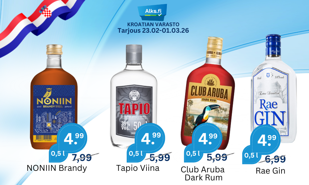 Suosittuja tuotteita AlePure Divine Vodka 37.5% 3 l BIB 30.99€ Alkuperäinen hinta oli: 30.99€.23.99€Nykyinen hinta on: 23.99€. - Pure Divine Vodka 37.5% 3 l BIB määrä + Lisää ostoskoriin AleDr. Zenzen Riesling 11.5% 3 l BIB 10.99€ Alkuperäinen hinta oli: 10.99€.9.99€Nykyinen hinta on: 9.99€. - Dr. Zenzen Riesling 11.5% 3 l BIB määrä + Lisää ostoskoriin AleHartwall Hard Seltzer Raspberry 4.5% 24×0.33 l 25.99€ Alkuperäinen hinta oli: 25.99€.23.99€Nykyinen hinta on: 23.99€. - Hartwall Hard Seltzer Raspberry 4.5% 24x0.33 l määrä + Lisää ostoskoriin AleHartwall GLÖGG Original Long Drink 5.5% 24×0.33 l 29.99€ Alkuperäinen hinta oli: 29.99€.17.99€Nykyinen hinta on: 17.99€. - Hartwall GLÖGG Original Long Drink 5.5% 24x0.33 l määrä + Lisää ostoskoriin AleKoff LIME & VODKA Long Drink 5.5% 24×0.33 l 23.99€ Alkuperäinen hinta oli: 23.99€.19.99€Nykyinen hinta on: 19.99€. - Koff LIME & VODKA Long Drink 5.5% 24x0.33 l määrä + Lisää ostoskoriin AleA. Le Coq G:N WATERMELON Long Drink 5.5% 24×0.33 l 17.99€ Alkuperäinen hinta oli: 17.99€.15.99€Nykyinen hinta on: 15.99€. - A. Le Coq G:N WATERMELON Long Drink 5.5% 24x0.33 l määrä + Lisää ostoskoriin AleHartwall Hard Seltzer Lemon 4.5% 24×0.33 l 25.99€ Alkuperäinen hinta oli: 25.99€.23.99€Nykyinen hinta on: 23.99€. - Hartwall Hard Seltzer Lemon 4.5% 24x0.33 l määrä + Lisää ostoskoriin AleHartwall GIN & LEMONADE Original Long Drink 5.5% 24×0.33l Best Before: 30.03.2026 29.99€ Alkuperäinen hinta oli: 29.99€.18.99€Nykyinen hinta on: 18.99€. - Hartwall GIN & LEMONADE Original Long Drink 5.5% 24x0.33l Best Before: 30.03.2026 määrä + Lisää ostoskoriin AleHalti Viina 32% 10×0.5 l PET 54.90€ Alkuperäinen hinta oli: 54.90€.35.99€Nykyinen hinta on: 35.99€. - Halti Viina 32% 10x0.5 l PET määrä + Lisää ostoskoriin Punaviini Näytä kaikki AleSun of Africa Cape Red 13% 3 l BIB 7.99€ Alkuperäinen hinta oli: 7.99€.6.99€Nykyinen hinta on: 6.99€. - Sun of Africa Cape Red 13% 3 l BIB määrä + Lisää ostoskoriin AleNeon Cabernet Sauvignon 13.5% 3 l BIB 8.99€ Alkuperäinen hinta oli: 8.99€.7.79€Nykyinen hinta on: 7.79€. - Neon Cabernet Sauvignon 13.5% 3 l BIB määrä + Lisää ostoskoriin JP. Chenet Cabernet Syrah 12.5% 3 l BIB 13.99€ - JP. Chenet Cabernet Syrah 12.5% 3 l BIB määrä + Lisää ostoskoriin Piccini Appassimento Puglia IGT 15% 3 l BIB 16.99€ - Piccini Appassimento Puglia IGT 15% 3 l BIB määrä + Lisää ostoskoriin Penasol Sangria Original 7% 3 l BIB 7.99€ - Penasol Sangria Original 7% 3 l BIB määrä + Lisää ostoskoriin Barefoot Cabernet Sauvignon 13% 0.75 l 7.99€ - Barefoot Cabernet Sauvignon 13% 0.75 l määrä + Lisää ostoskoriin CECCHI Chianti DOCG Riserva 13% 0.75 l 8.99€ - CECCHI Chianti DOCG Riserva 13% 0.75 l määrä + Lisää ostoskoriin AleTerra Molino Tempranillo 11% 3 l BIB 7.99€ Alkuperäinen hinta oli: 7.99€.6.99€Nykyinen hinta on: 6.99€. - Terra Molino Tempranillo 11% 3 l BIB määrä + Lisää ostoskoriin Korlat Merlot Eco 14.5% 0.75 l 17.99€ - Korlat Merlot Eco 14.5% 0.75 l määrä + Lisää ostoskoriin Gato Negro Merlot 13% 0.75 l 4.99€ Lisää ostoskoriin Valkoviini Näytä kaikki AleSanta Babera Sauvignon Blanc 12.4% 3 l BIB Filled: 09.08.2024 11.99€ Alkuperäinen hinta oli: 11.99€.6.99€Nykyinen hinta on: 6.99€. - Santa Babera Sauvignon Blanc 12.4% 3 l BIB Filled: 09.08.2024 määrä + Lisää ostoskoriin Vincenzo Grande Vino Bianco 11.5% 0.75 l 4.99€ - Vincenzo Grande Vino Bianco 11.5% 0.75 l määrä + Lisää ostoskoriin Black Tower Fruity White 8.5% 3 l BIB 11.99€ - Black Tower Fruity White 8.5% 3 l BIB määrä + Lisää ostoskoriin Verosso Chardonnay 12% 0.75 l 5.99€ - Verosso Chardonnay 12% 0.75 l määrä + Lisää ostoskoriin AleSouth Cape White 12.5% 3 l BIB 7.99€ Alkuperäinen hinta oli: 7.99€.5.99€Nykyinen hinta on: 5.99€. - South Cape White 12.5% 3 l BIB määrä + Lisää ostoskoriin AleMaybach Riesling Trocken 12% 0.75 l 4.99€ Alkuperäinen hinta oli: 4.99€.3.99€Nykyinen hinta on: 3.99€. - Maybach Riesling Trocken 12% 0.75 l määrä + Lisää ostoskoriin Gato Negro Chardonnay 13% 0.75 l 4.99€ - Gato Negro Chardonnay 13% 0.75 l määrä + Lisää ostoskoriin Dr. Pauly-Bergweiler Noble House Riesling Trocken 11% 0.75 l 5.99€ - Dr. Pauly-Bergweiler Noble House Riesling Trocken 11% 0.75 l määrä + Lisää ostoskoriin JP. Chenet Colombard Sauvignon 10.5% 3 l BIB 13.99€ - JP. Chenet Colombard Sauvignon 10.5% 3 l BIB määrä + Lisää ostoskoriin Vina Maipo Chardonnay 13% 0.75 l 3.99€ - Vina Maipo Chardonnay 13% 0.75 l määrä + Lisää ostoskoriin Uudet Tuotteet Näytä kaikki Happy Joe Dry Apple Cider 4.7% 24×0.33 l 18.99€ - Happy Joe Dry Apple Cider 4.7% 24x0.33 l määrä + Lisää ostoskoriin AleSomersby Apple 4.5% 24×0.33 l 18.99€ Alkuperäinen hinta oli: 18.99€.17.99€Nykyinen hinta on: 17.99€. - Somersby Apple 4.5% 24x0.33 l määrä + Lisää ostoskoriin Happy Joe Cloudy Apple Cider 4.7% 24×0.33 l 18.99€ - Happy Joe Cloudy Apple Cider 4.7% 24x0.33 l määrä + Lisää ostoskoriin Happy Joe Extra Dry Pear Cider 4.5% 24×0.33 l 18.99€ - Happy Joe Extra Dry Pear Cider 4.5% 24×0.33 l määrä + Lisää ostoskoriin AleSomersby Pear 4.5% 24×0.33 l 18.99€ Alkuperäinen hinta oli: 18.99€.17.99€Nykyinen hinta on: 17.99€. - Somersby Pear 4.5% 24x0.33 l määrä + Lisää ostoskoriin AleIbis XO French Brandy 36% 1 l 21.99€ Alkuperäinen hinta oli: 21.99€.18.99€Nykyinen hinta on: 18.99€. - Ibis XO French Brandy 36% 1 l määrä + Lisää ostoskoriin AleViin 40% 0.5 l PET 5.99€ Alkuperäinen hinta oli: 5.99€.5.29€Nykyinen hinta on: 5.29€. - Viin 40% 0.5 l PET määrä + Lisää ostoskoriin AleClub Aruba White Rum 37.5% 0.5 l PET 5.99€ Alkuperäinen hinta oli: 5.99€.5.39€Nykyinen hinta on: 5.39€. - Club Aruba White Rum 37.5% 0.5 l PET määrä + Lisää ostoskoriin 