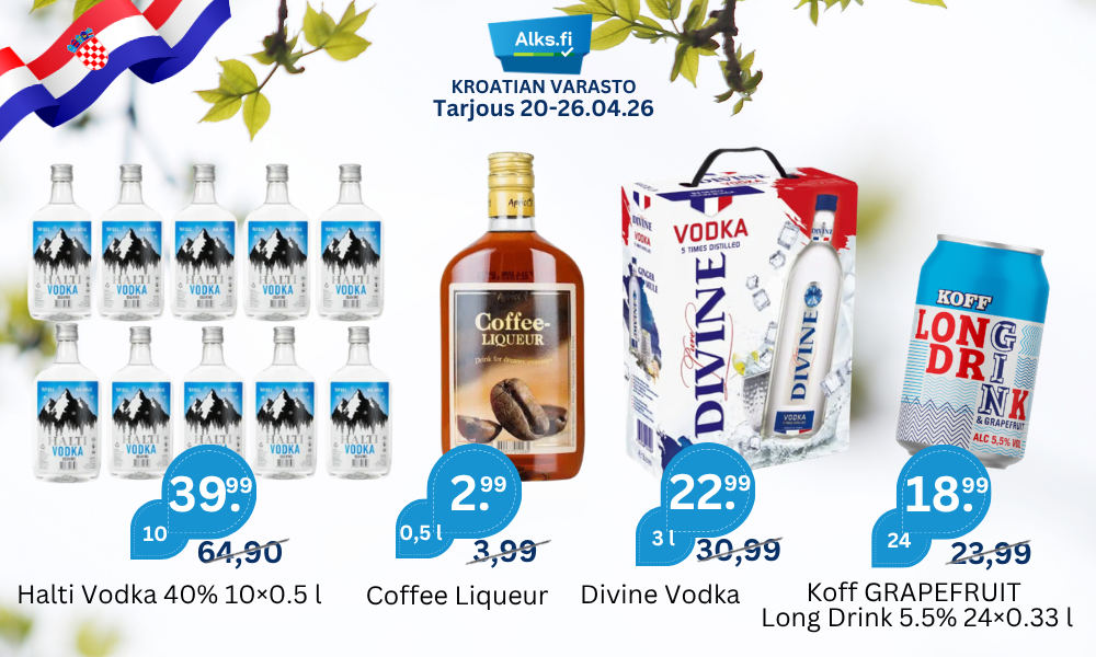 Suosittuja tuotteita AlePure Divine Vodka 37.5% 3 l BIB 30.99€ Alkuperäinen hinta oli: 30.99€.22.99€Nykyinen hinta on: 22.99€. - Pure Divine Vodka 37.5% 3 l BIB määrä + Lisää ostoskoriin AleKoff PINEAPPLE Long Drink 5.5% 24×0.33 l 23.99€ Alkuperäinen hinta oli: 23.99€.18.99€Nykyinen hinta on: 18.99€. - Koff PINEAPPLE Long Drink 5.5% 24x0.33 l määrä + Lisää ostoskoriin AleKoff GRAPEFRUIT Long Drink 5.5% 24×0.33 l 23.99€ Alkuperäinen hinta oli: 23.99€.20.99€Nykyinen hinta on: 20.99€. - Koff GRAPEFRUIT Long Drink 5.5% 24x0.33 l määrä + Lisää ostoskoriin AleSuomi Viina 32% 0.5 l PET 5.99€ Alkuperäinen hinta oli: 5.99€.3.99€Nykyinen hinta on: 3.99€. - Suomi Viina 32% 0.5 l PET määrä + Lisää ostoskoriin AleA. Le Coq G:N WATERMELON Long Drink 5.5% 24×0.33 l 17.99€ Alkuperäinen hinta oli: 17.99€.12.99€Nykyinen hinta on: 12.99€. - A. Le Coq G:N WATERMELON Long Drink 5.5% 24x0.33 l määrä + Lisää ostoskoriin AleHartwall Hard Seltzer Lemon 4.5% 24×0.33 l Best Before: 16.04.2026 25.99€ Alkuperäinen hinta oli: 25.99€.17.99€Nykyinen hinta on: 17.99€. - Hartwall Hard Seltzer Lemon 4.5% 24x0.33 l Best Before: 16.04.2026 määrä + Lisää ostoskoriin AleHartwall GIN & LEMONADE Original Long Drink 5.5% 24×0.33l Best Before: 30.03.2026 29.99€ Alkuperäinen hinta oli: 29.99€.14.99€Nykyinen hinta on: 14.99€. - Hartwall GIN & LEMONADE Original Long Drink 5.5% 24x0.33l Best Before: 30.03.2026 määrä + Lisää ostoskoriin AleSt.Holstre Brandy 36% 0.5 l PET 5.99€ Alkuperäinen hinta oli: 5.99€.4.29€Nykyinen hinta on: 4.29€. - St.Holstre Brandy 36% 0.5 l PET määrä + Lisää ostoskoriin Andes Chardonnay 12% 0.75 l 2.99€ - Andes Chardonnay 12% 0.75 l määrä + Lisää ostoskoriin Punaviini Näytä kaikki Makulu Winemaker’s Blend Red 13.0% 0.75 l 2.99€ - Makulu Winemaker's Blend Red 13.0% 0.75 l määrä + Lisää ostoskoriin Gato Negro Cabernet Sauvignon 13% 0.75 l 4.99€ - Gato Negro Cabernet Sauvignon 13% 0.75 l määrä + Lisää ostoskoriin Penasol Sangria Original 7% 3 l BIB 7.99€ - Penasol Sangria Original 7% 3 l BIB määrä + Lisää ostoskoriin Gran San-Tiago Merlot Shiraz 13.5% 3 l BIB 9.99€ - Gran San-Tiago Merlot Shiraz 13.5% 3 l BIB määrä + Lisää ostoskoriin Korlat Merlot Eco 14.5% 0.75 l 17.99€ - Korlat Merlot Eco 14.5% 0.75 l määrä + Lisää ostoskoriin AleMakulu Cape Red 12.5% 3 l BIB 8.99€ Alkuperäinen hinta oli: 8.99€.6.99€Nykyinen hinta on: 6.99€. Lisää ostoskoriin Babić 12.5% 0.75 l 11.99€ Lisää ostoskoriin Andes Cabernet Sauvignon 13% 0.75 l 2.99€ - Andes Cabernet Sauvignon 13% 0.75 l määrä + Lisää ostoskoriin AleCrocodile Creek Shiraz Cabernet Sauvignon 13.5% 3 l BIB 10.99€ Alkuperäinen hinta oli: 10.99€.9.99€Nykyinen hinta on: 9.99€. - Crocodile Creek Shiraz Cabernet Sauvignon 13.5% 3 l BIB määrä + Lisää ostoskoriin Piccini Appassimento Puglia IGT 15% 3 l BIB 16.99€ - Piccini Appassimento Puglia IGT 15% 3 l BIB määrä + Lisää ostoskoriin Valkoviini Näytä kaikki AleChilandia Classic White 12.5% 3 l BIB 7.99€ Alkuperäinen hinta oli: 7.99€.6.99€Nykyinen hinta on: 6.99€. - Chilandia Classic White 12.5% 3 l BIB määrä + Lisää ostoskoriin Jean Biecher & Fils Alsace Riesling 12% 0.75 l 6.29€ - Jean Biecher & Fils Alsace Riesling 12% 0.75 l määrä + Lisää ostoskoriin Piccini Italian Origins Pinot Grigio DOC 12.5% 0.75 l 4.99€ - Piccini Italian Origins Pinot Grigio DOC 12.5% 0.75 l määrä + Lisää ostoskoriin Jean Biecher & Fils Alsace Pinot Gris 12% 0.75 l 5.99€ - Jean Biecher & Fils Alsace Pinot Gris 12% 0.75 l määrä + Lisää ostoskoriin Gato Negro Chardonnay 13% 0.75 l 4.99€ - Gato Negro Chardonnay 13% 0.75 l määrä + Lisää ostoskoriin AleCrocodile Creek Chardonnay South Eastern Australia 12.5% 3 l BIB 10.99€ Alkuperäinen hinta oli: 10.99€.9.99€Nykyinen hinta on: 9.99€. - Crocodile Creek Chardonnay South Eastern Australia 12.5% 3 l BIB määrä + Lisää ostoskoriin AleGato Negro Sauvignon Blanc 12% 0.75 l 4.99€ Alkuperäinen hinta oli: 4.99€.3.99€Nykyinen hinta on: 3.99€. - Gato Negro Sauvignon Blanc 12% 0.75 l määrä + Lisää ostoskoriin JP. Chenet Colombard Sauvignon 10.5% 3 l BIB 13.99€ - JP. Chenet Colombard Sauvignon 10.5% 3 l BIB määrä + Lisää ostoskoriin Mertes Piesporter Michelsbeg Kabinett 9.5% 0.75 l 3.49€ - Mertes Piesporter Michelsbeg Kabinett 9.5% 0.75 l määrä + Lisää ostoskoriin AleJP Chenet Colombard Sauvignon 12% 0.25 l 1.59€ Alkuperäinen hinta oli: 1.59€.1.19€Nykyinen hinta on: 1.19€. - JP Chenet Colombard Sauvignon 12% 0.25 l määrä + Lisää ostoskoriin Uudet Tuotteet Näytä kaikki AleCandy Shop Caramel Vodka 37.5% 0.5 l 5.99€ Alkuperäinen hinta oli: 5.99€.4.99€Nykyinen hinta on: 4.99€. - Candy Shop Caramel Vodka 37.5% 0.5 l määrä + Lisää ostoskoriin AleCandy Shop Coconut 37.5% 0.5 l 5.99€ Alkuperäinen hinta oli: 5.99€.4.99€Nykyinen hinta on: 4.99€. - Candy Shop Coconut 37.5% 0.5 l määrä + Lisää ostoskoriin AleCandy Shop Peppermint 37.5% 0.5 l 5.99€ Alkuperäinen hinta oli: 5.99€.4.99€Nykyinen hinta on: 4.99€. - Candy Shop Peppermint 37.5% 0.5 l määrä + Lisää ostoskoriin AleKoff PINEAPPLE Long Drink 5.5% 24×0.33 l 23.99€ Alkuperäinen hinta oli: 23.99€.18.99€Nykyinen hinta on: 18.99€. - Koff PINEAPPLE Long Drink 5.5% 24x0.33 l määrä + Lisää ostoskoriin AleHartwall PEACH ICE TEA Original Long Drink 5.5% 24×0.33 l 28.99€ Alkuperäinen hinta oli: 28.99€.26.99€Nykyinen hinta on: 26.99€. - Hartwall PEACH ICE TEA Original Long Drink 5.5% 24x0.33 l määrä + Lisää ostoskoriin Happy Joe Dry Apple Cider 4.7% 24×0.33 l 18.99€ - Happy Joe Dry Apple Cider 4.7% 24x0.33 l määrä + Lisää ostoskoriin AleSomersby Apple 4.5% 24×0.33 l 18.99€ Alkuperäinen hinta oli: 18.99€.17.99€Nykyinen hinta on: 17.99€. - Somersby Apple 4.5% 24x0.33 l määrä + Lisää ostoskorii