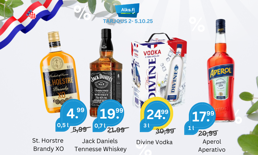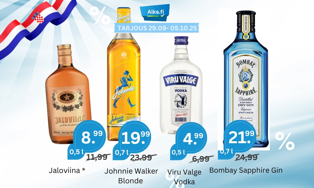 Suosittuja tuotteita AleSuomi Viina 32% 0.5 l PET 5.99€ Alkuperäinen hinta oli: 5.99€.4.29€Nykyinen hinta on: 4.29€. - Suomi Viina 32% 0.5 l PET määrä + Lisää ostoskoriin AlePure Divine Vodka 37.5% 3 l BIB 30.99€ Alkuperäinen hinta oli: 30.99€.24.99€Nykyinen hinta on: 24.99€. - Pure Divine Vodka 37.5% 3 l BIB määrä + Lisää ostoskoriin AleDr. Zenzen Riesling 11.5% 3 l BIB 10.99€ Alkuperäinen hinta oli: 10.99€.9.99€Nykyinen hinta on: 9.99€. - Dr. Zenzen Riesling 11.5% 3 l BIB määrä + Lisää ostoskoriin AleHartwall Hard Seltzer Raspberry 4.5% 24×0.33 l 25.99€ Alkuperäinen hinta oli: 25.99€.23.99€Nykyinen hinta on: 23.99€. - Hartwall Hard Seltzer Raspberry 4.5% 24x0.33 l määrä + Lisää ostoskoriin AleHartwall GLÖGG Original Long Drink 5.5% 24×0.33 l 29.99€ Alkuperäinen hinta oli: 29.99€.27.49€Nykyinen hinta on: 27.49€. - Hartwall GLÖGG Original Long Drink 5.5% 24x0.33 l määrä + Lisää ostoskoriin AleA. Le Coq G:N Grapefruit Long Drink 5.5% 24×0.33 l 17.99€ Alkuperäinen hinta oli: 17.99€.14.99€Nykyinen hinta on: 14.99€. - A. Le Coq G:N Grapefruit Long Drink 5.5% 24x0.33 l määrä + Lisää ostoskoriin AleHalti Viina 32% 10×0.5 l PET 54.90€ Alkuperäinen hinta oli: 54.90€.32.99€Nykyinen hinta on: 32.99€. - Halti Viina 32% 10x0.5 l PET määrä + Lisää ostoskoriin AleNoniin Vodka 40% 10×0.5 l PET 69.90€ Alkuperäinen hinta oli: 69.90€.44.99€Nykyinen hinta on: 44.99€. - Noniin Vodka 40% 10x0.5 l PET määrä + Lisää ostoskoriin AleLaua Viin 40% 10×0.5 l 69.90€ Alkuperäinen hinta oli: 69.90€.46.99€Nykyinen hinta on: 46.99€. - Laua Viin 40% 10x0.5 l määrä + Lisää ostoskoriin AleKoff GRAPEFRUIT Long Drink 5.5% 24×0.33 l 23.99€ Alkuperäinen hinta oli: 23.99€.19.99€Nykyinen hinta on: 19.99€. - Koff GRAPEFRUIT Long Drink 5.5% 24x0.33 l määrä + Lisää ostoskoriin Punaviini Näytä kaikki Trementi Nero d’Avola Cabernet Sauvignon 13.5% 0.75 l 6.99€ - Trementi Nero d'Avola Cabernet Sauvignon 13.5% 0.75 l määrä + Lisää ostoskoriin Montgras De Vine Reserva Cabernet Sauvignon 13.5% 0.75 l 6.99€ - Montgras De Vine Reserva Cabernet Sauvignon 13.5% 0.75 l määrä + Lisää ostoskoriin Neon Cabernet Sauvignon 13.5% 3 l BIB 8.99€ - Neon Cabernet Sauvignon 13.5% 3 l BIB määrä + Lisää ostoskoriin Andes Cabernet Sauvignon 13% 0.75 l 2.99€ - Andes Cabernet Sauvignon 13% 0.75 l määrä + Lisää ostoskoriin Barefoot Cabernet Sauvignon 13% 0.75 l 7.99€ - Barefoot Cabernet Sauvignon 13% 0.75 l määrä + Lisää ostoskoriin Korlat Merlot Eco 14.5% 0.75 l 17.99€ - Korlat Merlot Eco 14.5% 0.75 l määrä + Lisää ostoskoriin Hans Baer Pinot Noir Trocken 12% 0.75 l 5.99€ - Hans Baer Pinot Noir Trocken 12% 0.75 l määrä + Lisää ostoskoriin Gato Negro Merlot 13% 0.75 l 4.99€ - Gato Negro Merlot 13% 0.75 l määrä + Lisää ostoskoriin Piccini Memoro Montepulciano d’ Abruzzo 13.5% 0.75 l 6.49€ - Piccini Memoro Montepulciano d' Abruzzo 13.5% 0.75 l määrä + Lisää ostoskoriin Babić Vhrunski 13% 0.75 l 21.99€ - Babić Vhrunski 13% 0.75 l määrä + Lisää ostoskoriin Valkoviini Näytä kaikki Maybach Chardonnay Trocken 12% 0.75 l 4.99€ - Maybach Chardonnay Trocken 12% 0.75 l määrä + Lisää ostoskoriin JP Chenet Colombard Sauvignon 12% 0.25 l 1.59€ - JP Chenet Colombard Sauvignon 12% 0.25 l määrä + Lisää ostoskoriin Makulu Cape White 12.5% 3 l BIB 8.99€ - Makulu Cape White 12.5% 3 l BIB määrä + Lisää ostoskoriin Makulu White Winemaker’s Blend 13.0% 0.75 l 2.99€ Lisää ostoskoriin AleSun of Africa Cape White 12% 3 l BIB 7.99€ Alkuperäinen hinta oli: 7.99€.6.99€Nykyinen hinta on: 6.99€. - Sun of Africa Cape White 12% 3 l BIB määrä + Lisää ostoskoriin Cero Coma White 0.0% Alcohol Free 0.75 l 4.99€ - Cero Coma White 0.0% Alcohol Free 0.75 l määrä + Lisää ostoskoriin Jean Biecher & Fils Alsace Pinot Gris 12% 0.75 l 5.99€ - Jean Biecher & Fils Alsace Pinot Gris 12% 0.75 l määrä + Lisää ostoskoriin Jean Biecher & Fils Alsace Pinot Blanc 12.5% 0.75 l 5.99€ - Jean Biecher & Fils Alsace Pinot Blanc 12.5% 0.75 l määrä + Lisää ostoskoriin Jean Biecher & Fils Alsace Riesling 12% 0.75 l 6.29€ - Jean Biecher & Fils Alsace Riesling 12% 0.75 l määrä + Lisää ostoskoriin Verosso Chardonnay 12% 0.75 l 5.99€ - Verosso Chardonnay 12% 0.75 l määrä + Lisää ostoskoriin Uudet Tuotteet Näytä kaikki AleSaaremaa Cur Gin 37.5% 0.5 l 9.99€ Alkuperäinen hinta oli: 9.99€.7.99€Nykyinen hinta on: 7.99€. - Saaremaa Cur Gin 37.5% 0.5 l määrä + Lisää ostoskoriin AleSaaremaa Ore Gin 37.5% 0.5 l 9.99€ Alkuperäinen hinta oli: 9.99€.7.99€Nykyinen hinta on: 7.99€. - Saaremaa Ore Gin 37.5% 0.5 l määrä + Lisää ostoskoriin AleSaaremaa Rhu Gin 37.5% 0.5 l 9.99€ Alkuperäinen hinta oli: 9.99€.7.99€Nykyinen hinta on: 7.99€. - Saaremaa Rhu Gin 37.5% 0.5 l määrä + Lisää ostoskoriin AleSaaremaa Ras Gin 37.5% 0.5 l 9.99€ Alkuperäinen hinta oli: 9.99€.7.99€Nykyinen hinta on: 7.99€. - Saaremaa Ras Gin 37.5% 0.5 l määrä + Lisää ostoskoriin AleSaaremaa Dry Gin 37.5% 0.5 l 9.99€ Alkuperäinen hinta oli: 9.99€.7.99€Nykyinen hinta on: 7.99€. - Saaremaa Dry Gin 37.5% 0.5 l määrä + Lisää ostoskoriin AleSaaremaa Pas Gin 37.5% 0.5 l 9.99€ Alkuperäinen hinta oli: 9.99€.7.99€Nykyinen hinta on: 7.99€. - Saaremaa Pas Gin 37.5% 0.5 l määrä + Lisää ostoskoriin Paddy Irish Whiskey 40% 1 l 21.99€ - Paddy Irish Whiskey 40% 1 l määrä + Lisää ostoskoriin AleA. Le Coq Beer Imperial Gold 4.8% 20×0.4 l Best Before: 08.07.2025 24.99€ Alkuperäinen hinta oli: 24.99€.9.99€Nykyinen hinta on: 9.99€. - A. Le Coq Beer Imperial Gold 4.8% 20x0.4 l Best Before: 08.07.2025 määrä + Lisää ostoskoriin AleA. Le Coq Beer Double Bock 7% 20×0.5 l Best Before: 29.08.2025 25.99€ Alkuperäinen hinta oli: 25.99€.9.99€Nykyinen hinta on: 9.99€. - A. Le Coq Beer Double