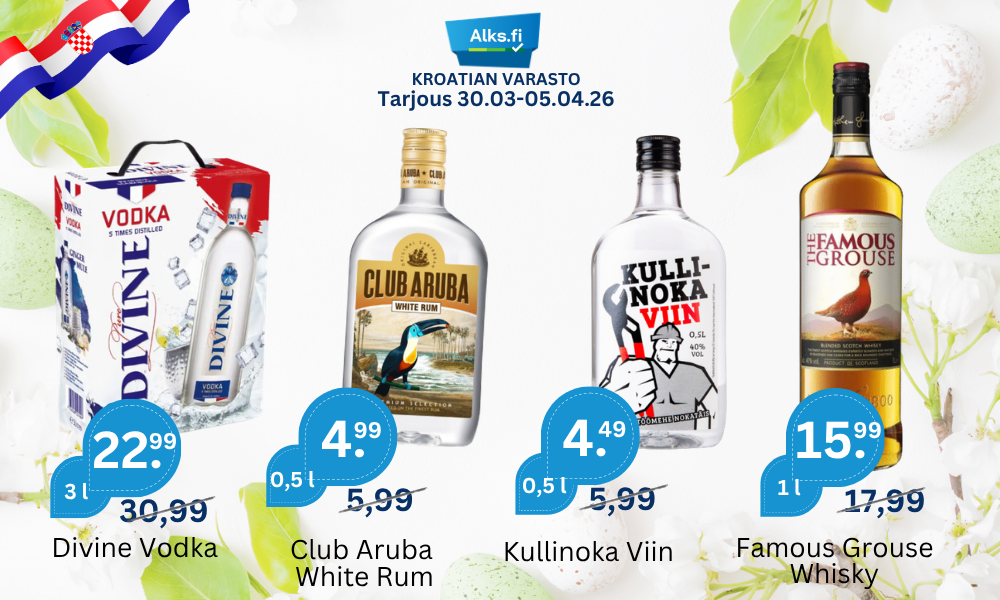 Suosittuja tuotteita AlePure Divine Vodka 37.5% 3 l BIB 30.99€ Alkuperäinen hinta oli: 30.99€.22.99€Nykyinen hinta on: 22.99€. - Pure Divine Vodka 37.5% 3 l BIB määrä + Lisää ostoskoriin AleHartwall Hard Seltzer Raspberry 4.5% 24×0.33 l 25.99€ Alkuperäinen hinta oli: 25.99€.24.99€Nykyinen hinta on: 24.99€. - Hartwall Hard Seltzer Raspberry 4.5% 24x0.33 l määrä + Lisää ostoskoriin AleHalti Viina 32% 10×0.5 l PET 54.90€ Alkuperäinen hinta oli: 54.90€.35.99€Nykyinen hinta on: 35.99€. - Halti Viina 32% 10x0.5 l PET määrä + Lisää ostoskoriin AleHartwall RED GRAPEFRUIT Original Long Drink 5.5% 24×0.33 l Best Before: 16.02.2026 28.99€ Alkuperäinen hinta oli: 28.99€.15.99€Nykyinen hinta on: 15.99€. - Hartwall RED GRAPEFRUIT Original Long Drink 5.5% 24x0.33 l Best Before: 16.02.2026 määrä + Lisää ostoskoriin AleA. Le Coq G:N WATERMELON Long Drink 5.5% 24×0.33 l 17.99€ Alkuperäinen hinta oli: 17.99€.15.99€Nykyinen hinta on: 15.99€. - A. Le Coq G:N WATERMELON Long Drink 5.5% 24x0.33 l määrä + Lisää ostoskoriin AleHartwall Hard Seltzer Lemon 4.5% 24×0.33 l Best Before: 16.04.2026 25.99€ Alkuperäinen hinta oli: 25.99€.20.99€Nykyinen hinta on: 20.99€. - Hartwall Hard Seltzer Lemon 4.5% 24x0.33 l Best Before: 16.04.2026 määrä + Lisää ostoskoriin AleHartwall GIN & LEMONADE Original Long Drink 5.5% 24×0.33l Best Before: 30.03.2026 29.99€ Alkuperäinen hinta oli: 29.99€.15.99€Nykyinen hinta on: 15.99€. - Hartwall GIN & LEMONADE Original Long Drink 5.5% 24x0.33l Best Before: 30.03.2026 määrä + Lisää ostoskoriin AleSt.Holstre Brandy 36% 0.5 l PET 5.99€ Alkuperäinen hinta oli: 5.99€.5.29€Nykyinen hinta on: 5.29€. - St.Holstre Brandy 36% 0.5 l PET määrä + Lisää ostoskoriin Andes Chardonnay 12% 0.75 l 2.99€ - Andes Chardonnay 12% 0.75 l määrä + Lisää ostoskoriin Punaviini Näytä kaikki AleNeon Cabernet Sauvignon 13.5% 3 l BIB 8.99€ Alkuperäinen hinta oli: 8.99€.7.79€Nykyinen hinta on: 7.79€. - Neon Cabernet Sauvignon 13.5% 3 l BIB määrä + Lisää ostoskoriin South Cape Red 12.5% 3 l BIB 7.99€ - South Cape Red 12.5% 3 l BIB määrä + Lisää ostoskoriin AleArt of the Refill Pinot Noir 13% 2.25 l Filled: 01.08.2024 6.99€ Alkuperäinen hinta oli: 6.99€.3.99€Nykyinen hinta on: 3.99€. - Art of the Refill Pinot Noir 13% 2.25 l Filled: 01.08.2024 määrä + Lisää ostoskoriin Makulu Winemaker’s Blend Red 13.0% 0.75 l 2.99€ - Makulu Winemaker's Blend Red 13.0% 0.75 l määrä + Lisää ostoskoriin Gran San-Tiago Merlot Shiraz 13.5% 3 l BIB 9.99€ - Gran San-Tiago Merlot Shiraz 13.5% 3 l BIB määrä + Lisää ostoskoriin JP. Chenet Cabernet Syrah 12.5% 3 l BIB 13.99€ - JP. Chenet Cabernet Syrah 12.5% 3 l BIB määrä + Lisää ostoskoriin AleCrocodile Creek Shiraz Cabernet Sauvignon 13.5% 3 l BIB 10.99€ Alkuperäinen hinta oli: 10.99€.9.99€Nykyinen hinta on: 9.99€. - Crocodile Creek Shiraz Cabernet Sauvignon 13.5% 3 l BIB määrä + Lisää ostoskoriin AleMakulu Cape Red 12.5% 3 l BIB 8.99€ Alkuperäinen hinta oli: 8.99€.6.99€Nykyinen hinta on: 6.99€. - Makulu Cape Red 12.5% 3 l BIB määrä + Lisää ostoskoriin Piccini Appassimento Puglia IGT 15% 3 l BIB 16.99€ - Piccini Appassimento Puglia IGT 15% 3 l BIB määrä + Lisää ostoskoriin Babić Vhrunski 13% 0.75 l 21.99€ - Babić Vhrunski 13% 0.75 l määrä + Lisää ostoskoriin Valkoviini Näytä kaikki Black Tower Fruity White 8.5% 3 l BIB 11.99€ - Black Tower Fruity White 8.5% 3 l BIB määrä + Lisää ostoskoriin Neon Riesling 11% 3 l BIB 9.99€ - Neon Riesling 11% 3 l BIB määrä + Lisää ostoskoriin AleGato Negro Sauvignon Blanc 12% 0.75 l 4.99€ Alkuperäinen hinta oli: 4.99€.3.99€Nykyinen hinta on: 3.99€. - Gato Negro Sauvignon Blanc 12% 0.75 l määrä + Lisää ostoskoriin Andes Chardonnay 12% 0.75 l 2.99€ - Andes Chardonnay 12% 0.75 l määrä + Lisää ostoskoriin AleSanta Babera Sauvignon Blanc 12.4% 3 l BIB Filled: 09.08.2024 11.99€ Alkuperäinen hinta oli: 11.99€.6.99€Nykyinen hinta on: 6.99€. - Santa Babera Sauvignon Blanc 12.4% 3 l BIB Filled: 09.08.2024 määrä + Lisää ostoskoriin AleNeon Chardonnay 11.5% 3 l BIB 8.99€ Alkuperäinen hinta oli: 8.99€.7.79€Nykyinen hinta on: 7.79€. - Neon Chardonnay 11.5% 3 l BIB määrä + Lisää ostoskoriin AleCrocodile Creek Chardonnay South Eastern Australia 12.5% 3 l BIB 10.99€ Alkuperäinen hinta oli: 10.99€.9.99€Nykyinen hinta on: 9.99€. - Crocodile Creek Chardonnay South Eastern Australia 12.5% 3 l BIB määrä + Lisää ostoskoriin Jean Biecher & Fils Alsace Riesling 12% 0.75 l 6.29€ - Jean Biecher & Fils Alsace Riesling 12% 0.75 l määrä + Lisää ostoskoriin AleBarefoot Pinot Grigio California 12.5% 0.75 l 7.99€ Alkuperäinen hinta oli: 7.99€.6.49€Nykyinen hinta on: 6.49€. - Barefoot Pinot Grigio California 12.5% 0.75 l määrä + Lisää ostoskoriin JP. Chenet Colombard Sauvignon 10.5% 3 l BIB 13.99€ - JP. Chenet Colombard Sauvignon 10.5% 3 l BIB määrä + Lisää ostoskoriin Uudet Tuotteet Näytä kaikki Hartwall PEACH ICE TEA Original Long Drink 5.5% 24×0.33 l 28.99€ - Hartwall PEACH ICE TEA Original Long Drink 5.5% 24x0.33 l määrä + Lisää ostoskoriin Happy Joe Dry Apple Cider 4.7% 24×0.33 l 18.99€ - Happy Joe Dry Apple Cider 4.7% 24x0.33 l määrä + Lisää ostoskoriin AleSomersby Apple 4.5% 24×0.33 l 18.99€ Alkuperäinen hinta oli: 18.99€.17.99€Nykyinen hinta on: 17.99€. - Somersby Apple 4.5% 24x0.33 l määrä + Lisää ostoskoriin Happy Joe Cloudy Apple Cider 4.7% 24×0.33 l 18.99€ - Happy Joe Cloudy Apple Cider 4.7% 24x0.33 l määrä + Lisää ostoskoriin Happy Joe Extra Dry Pear Cider 4.5% 24×0.33 l 18.99€ - Happy Joe Extra Dry Pear Cider 4.5% 24×0.33 l määrä + Lisää ostoskoriin AleSomersby Pear 4.5% 24×0.33 l 18.99€ Alkuperäinen hinta oli: 18.99€.17.99€Nykyinen hinta on: 17.99€. - Somersby Pear 4.5% 24x0.33 l määrä + Lis