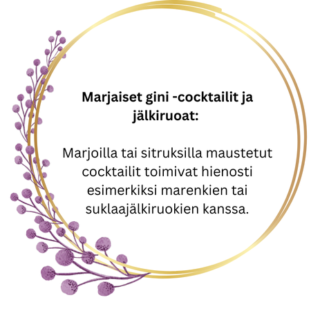 - Gin on herkullinen lisä myös jälkiruoissa. Gin antaa makeille herkuille raikkautta ja mausteisuutta.